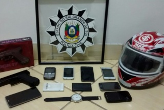 Recuperaram uma das motos furtadas, diversos celulares, relógio, capacete e uma das armas utilizadas nos assaltos realizados a pedestres e residências que aconteceram nos últimos dias.