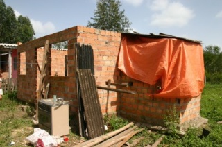 A pequena casa esta apenas com o alicerce e algumas paredes erguidas, não tem telhado nem aberturas, não tendo outra solução o casal cobriu com um plástico a minúscula peça onde será o banheiro da